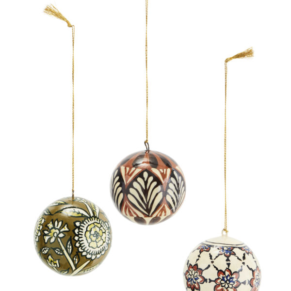 Décoration de Noël – Boule de Noël motifs fleuris peints en papier maché (beige, vert, orange) * Madam Stoltz