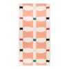 Nappe aux motifs de couleurs rectangulaires. Le fond est beige et les motifs sont verts, noirs, roses, rouges et gris. Elle est en coton.